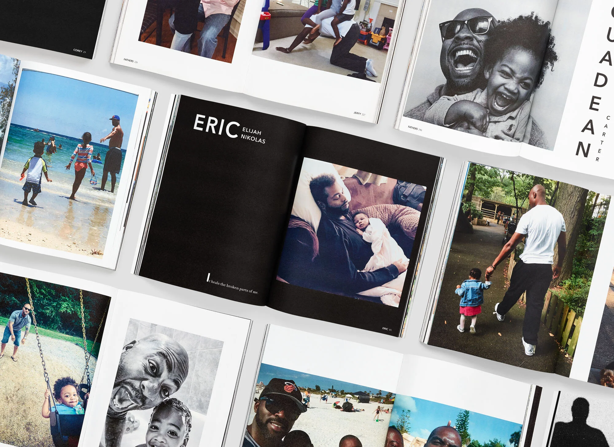 Fathers, Volume 1 is a 423-page book featuring images from the personal archives of the men represented in its pages. Composed of photos taken primarily on their mobile phones, Fathers explores the complexity and beauty of their lives as seen through their own lens. It is a testament to the power of shaping one's own narrative—of being seen—despite invisibility in mainstream media and elsewhere.